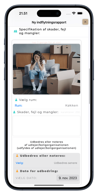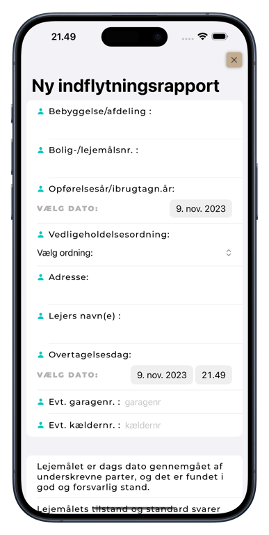 Det kan du på forsiden af appen den øverste knap som hedder Indflytningsrapport
